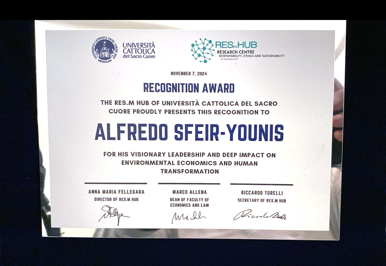 This recognition solidifies Alfredo Sfeir-Younis’ trajectory as a leading figure in the fields of economics, ecology, and spirituality, and reaffirms his commitment to building a more sustainable and just future.